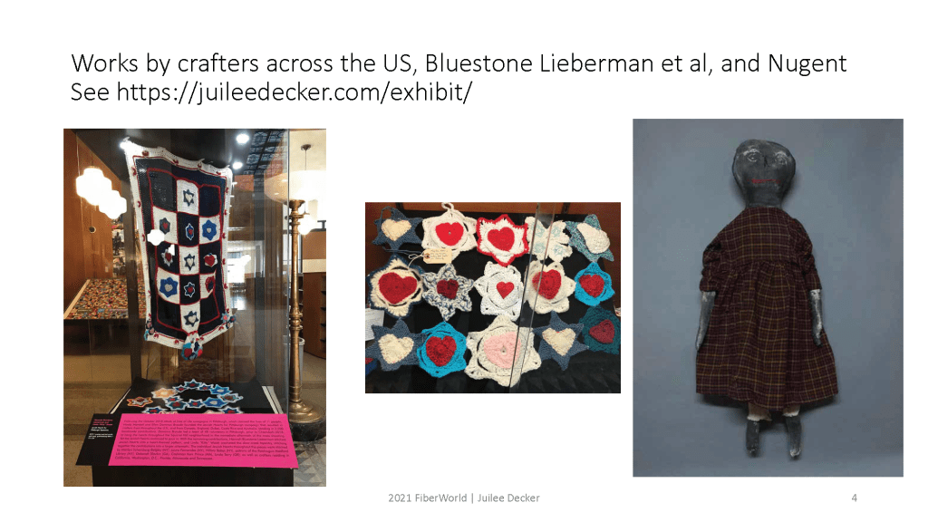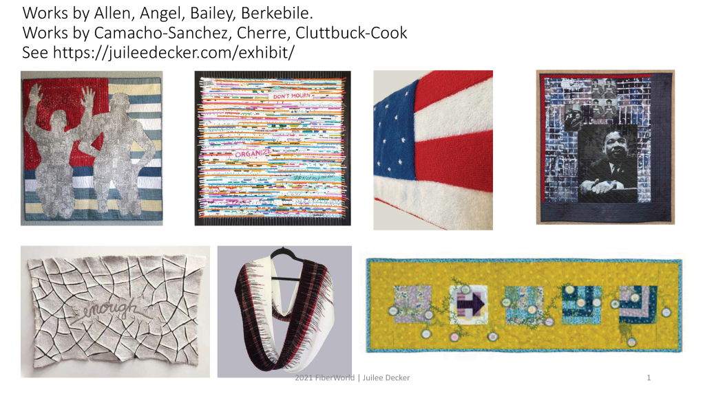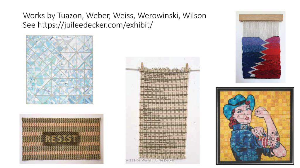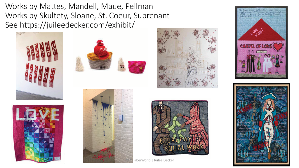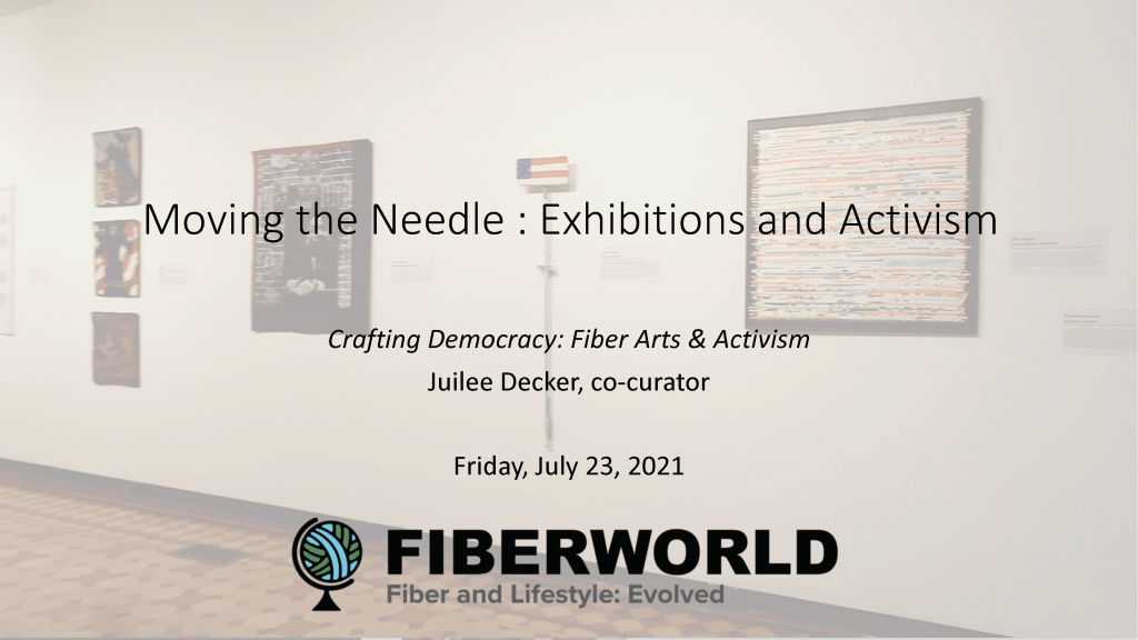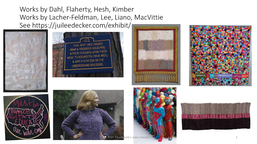 See images of the show here: https://juileedecker.com/exhibit/exhibit2/co-crafting-democracy-fiber-arts-activism-2024/.