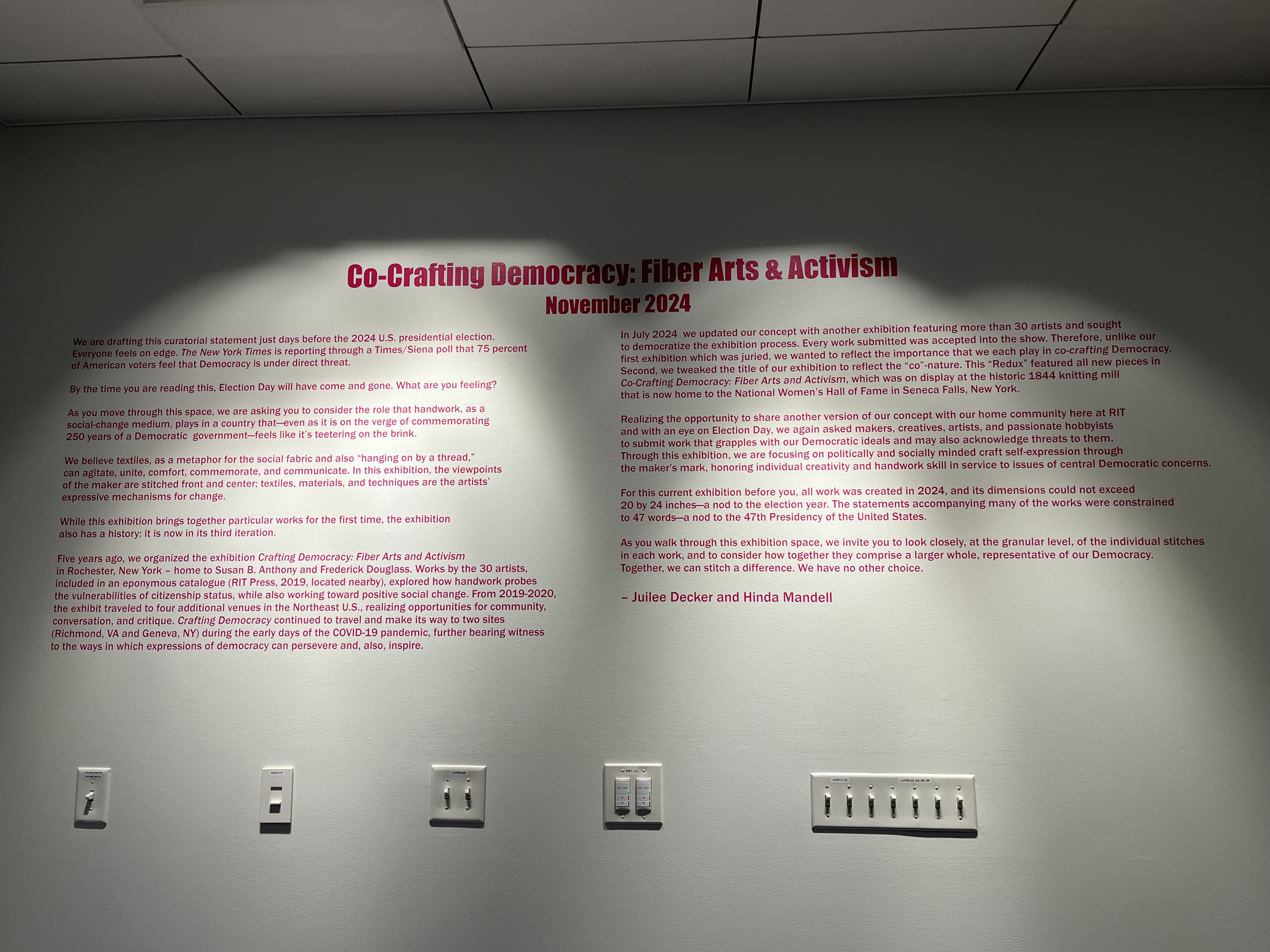 Questions can be directed to all three emails: the co-curators and their team: Juilee Decker (jdgsh@rit.edu ) and Hinda Mandell (hbmgpt@rit.edu) and craftingdemocracy@gmail.com