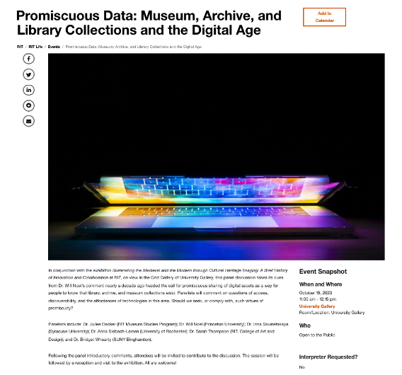Events related to courses: collaboration partners include the RIT Fantasy Club, WITR Radio Station, and faculty in museum studies and art history.